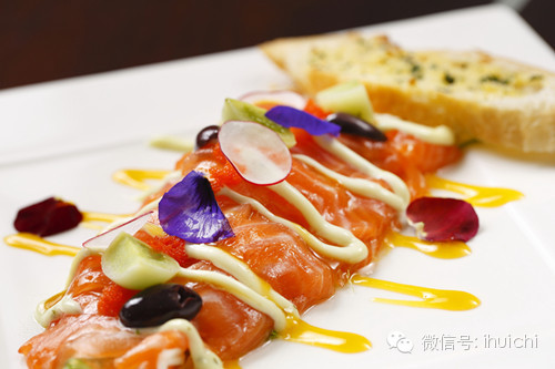 橙味三文鱼卷起朵朵娇艳的花朵,鲜嫩的鱼肉在阳光下闪耀着粉色瑰丽,色拉伴随着鱼肉入口即化,令人生醉,加上酥脆的面包,这道前菜一上来就让人赞不绝口!