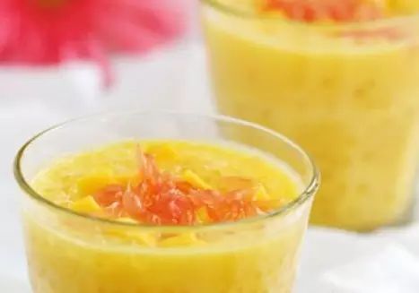 6、取出芒果椰汁浆,和西米混合在一起,淋上少许淡奶油,加芒果丁、西柚丝装饰即