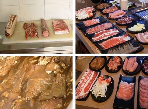 这家自助的价位分39元/位、59元/位和79元/位三档。根据价位,店家提供从九种到二三十种不同的肉类。肥牛、牛仔骨、牛舌、五花肉等肉类都是现切的,材料非常的新鲜。最受欢迎的是腌过的牛腿肉。在秘制酱汁的作用下,呈现一种微甜的口感。三种价位中,59元档的性价比最高,铺满桌子的牛羊肉,绝对可以满足大多数的食客了。