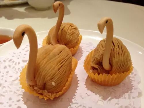 精致小巧的烧鹅酥不仅外型上像极了一只小天鹅,从外面的酥到里面的馅都是大厨亲自制作,揉面做皮,烤鹅做馅,面饼包裹着香嫩的黑棕鹅肉和各种菌菇,一经过油炸,立刻变得金黄酥脆,一口咬下去,那叫一个鲜香无比。