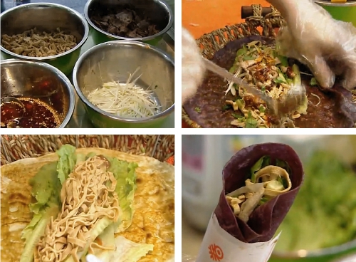 这个卤肉卷号称来自北京,价格从六七元到十三元不等,口味也有十八种,绝对的价廉物美,料多十足。饼皮都是全手工制成的,分为紫薯、抹茶、小麦和原味四种,既酥软又有嚼劲。中和南北口味的的酱汁,鲜香微甜。卤肉卷里还有千张丝,加入豆制品之后,不仅口感好,营养也更均衡。全透明的制作过程,可以自己选择喜欢的口味,人均10元的价格,绝对可以让你满满足足的吃上一顿。