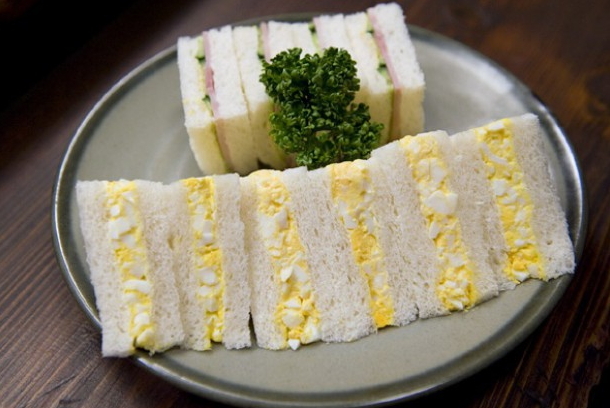 2、吐司切去四条边,夹入鸡蛋,切成三角形或小方块。