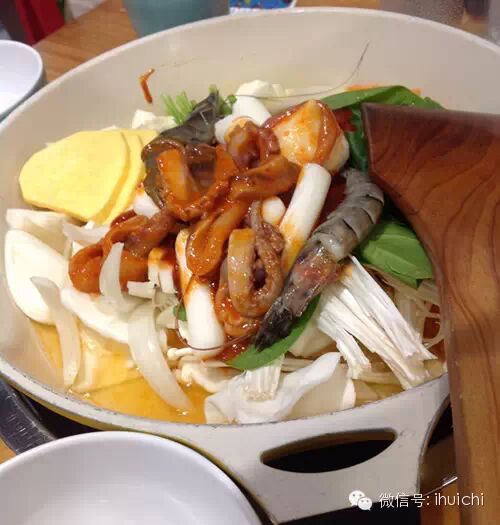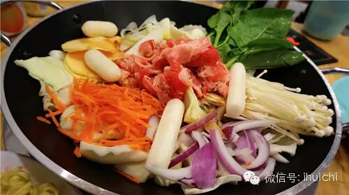 不一会儿,菜上齐了,一个锅子端上来,配合红肉绿菜,还挺好看的惹。锅底分为两种:年糕火锅和年糕铁板,我们点了海鲜芝士年糕火锅和春川铁板烤肉。