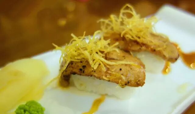 人广的店面是一辆老式电轨车,好像回到了十里洋场的感觉,店内布置的很简约但是不失清新之感,背景墙上贴满了食客们写下的便利贴,五颜六色,增添了不少温馨的感觉,相当有创意和老上海风情。吸引了不少目光。除了主打的寿司料理如鹅肝寿司、辣金枪鱼牛油果卷、七彩虹卷等比较有创意搭配的寿司之外,小编还要推荐一款嫩煎三文鱼鹅肝饭,三文鱼煎的外皮有点焦焦,内里嫩嫩的口感,再加上的紫菜的搭配,拌一拌饭吃,特别美味。