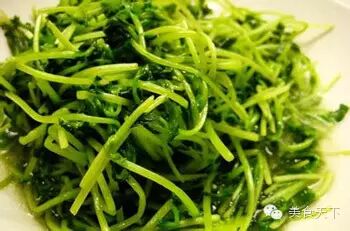 豆苗很容易去根~洗净控干水分。一开始就是素炒——豌豆苗放入油锅加适量盐、糖翻炒。主要就是出锅前烹入一勺半勺白酒,白酒要在出锅前喷,一般选择味道比较浓郁的酒。