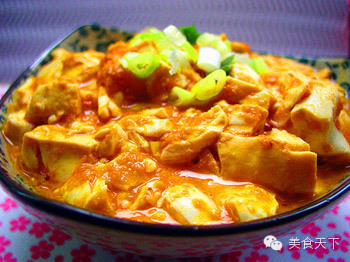 开中火炒郫县豆瓣酱(其他的诸如大料花椒什么的没有也无所谓,但是这个一定得有),出色放干辣椒和少许肉馅,肉馅变色了加一碗水。水开了放盒装豆腐,用盒装的不正宗,不过时间短也能入味。开了2分钟勾芡放香菜葱丝。完事了。