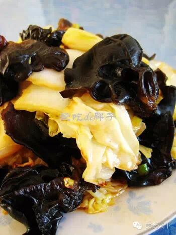 木耳泡好撕成小块,‘白菜帮’(不要绿叶)片成片——如果是块一会就加水焖会,但是不建议这样,片比较好——用盐杀去水分,挤干,腊肠或火腿什么的斜切片,没有不放也无所谓,就是不鲜了。