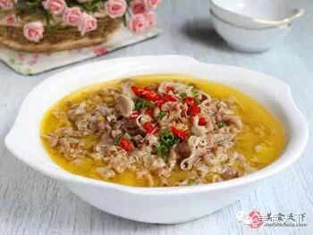 做法:把水烧开,放入切碎的咸鸭蛋和皮蛋(介个时候,很神奇的事情就发生类,清水变成了浓浓白白的高汤,而且还很鱼,不要问我为神马,我也不知道),放入金针菇,放盐、糖、鸡精、白醋若干,口味自便,最后放入肥牛,水烧开后装盘。