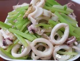 烧好锅,下油,将滴干水的鱿鱼倒进去,翻炒后,到芹菜放进去炒一起炒,调好味就可以起锅了。so easy!