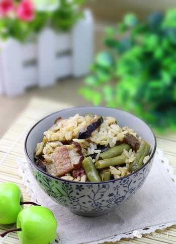 豆角炒一下,加好作料,然后加很多水,烧开后倒进只有米的电饭锅里。豆角焖饭,巨好吃。