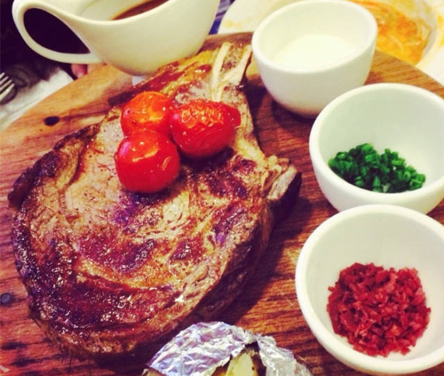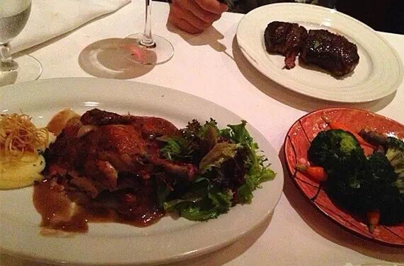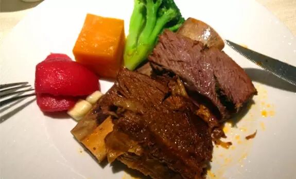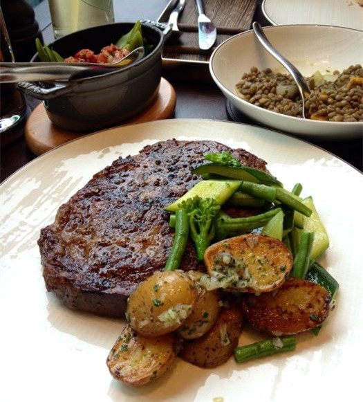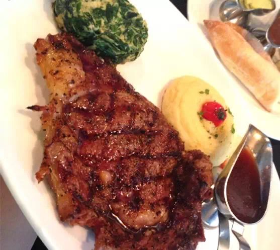 中午有218和318的套餐比较实惠,还配了龙虾汤。餐前面包就着黄油味道很不错。肉眼牛排5分熟的味道很好,配菜的土豆泥需要点赞,超好吃!主菜里面的上等T骨牛排鲜嫩多汁,带着点油花肥而不腻,入口即化的赶脚。PS:他家烤的偏熟,建议喜欢更嫩的点3分熟。