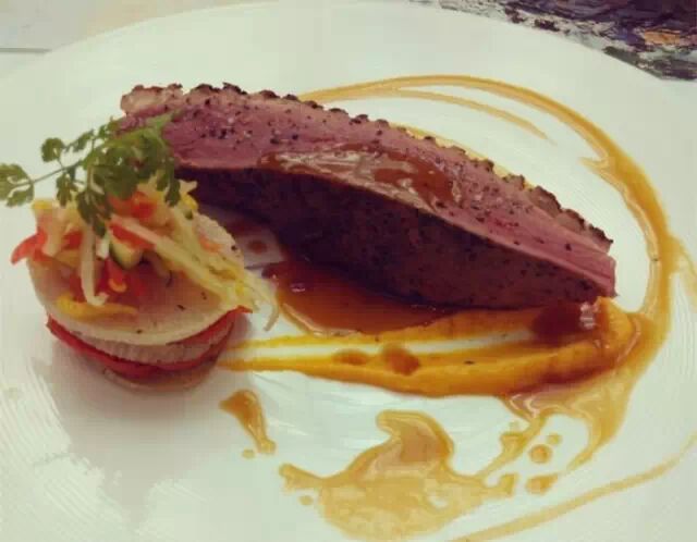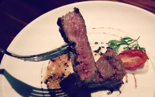 从吃货朋友那听说此地牛排甚好,不输于五六百块的高档餐馆。餐前面包配的酱是番茄丁酱很独特,金枪鱼沙律配芝麻酱摆盘漂亮,金枪鱼裹上芝麻烤过入口鲜嫩,蔬菜色拉也新鲜可口。牛排量灰常足很大一块,味道不错,连外国盆友都觉得很地道。吃完后餐厅主管还会贴心地的来询问菜式的味道和感受,无论是服务还是菜品都十分满意,拥有星级饭店的水准价格却是平易近人呢!