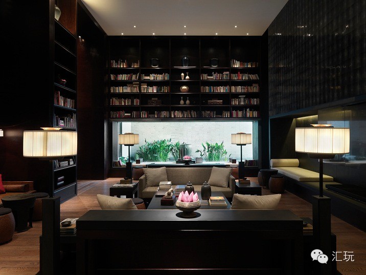 大堂狭长通道的左侧,一墙之隔的地方,别出心裁地设置了一个书廊,书架高过头顶,想要看,还得找工作人员帮忙。为了营造阅读的温馨感,设计师还在书廊里放置了一个火炉,冬季即可点燃。