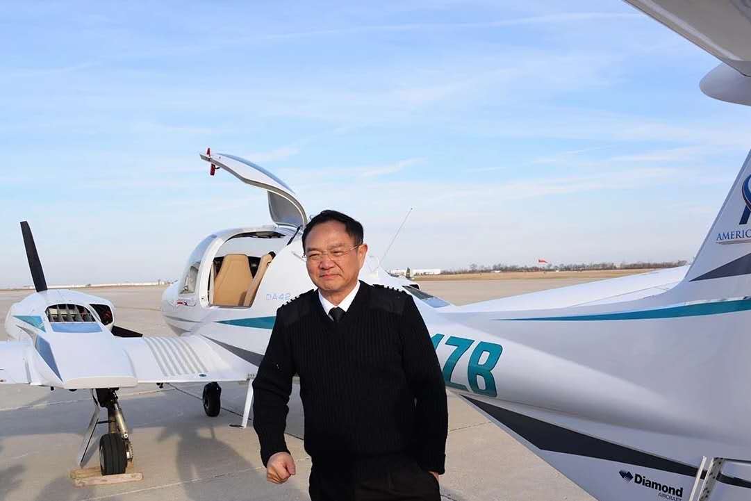 ▲中国驻芝加哥副总领事刘军(右三)等与张博(中)飞行团队在芝加哥南郊机场合影。|张大卫摄