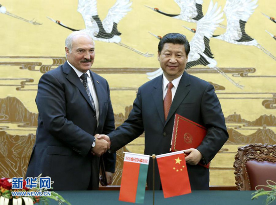 2013年7月16日,中国国家主席习近平在北京人民大会堂同白俄罗斯总统卢卡申科举行会谈。会谈后,两国元首共同签署《中华人民共和国和白俄罗斯共和国关于建立全面战略伙伴关系的联合声明》。新华社记者 庞兴雷 摄(资料图)