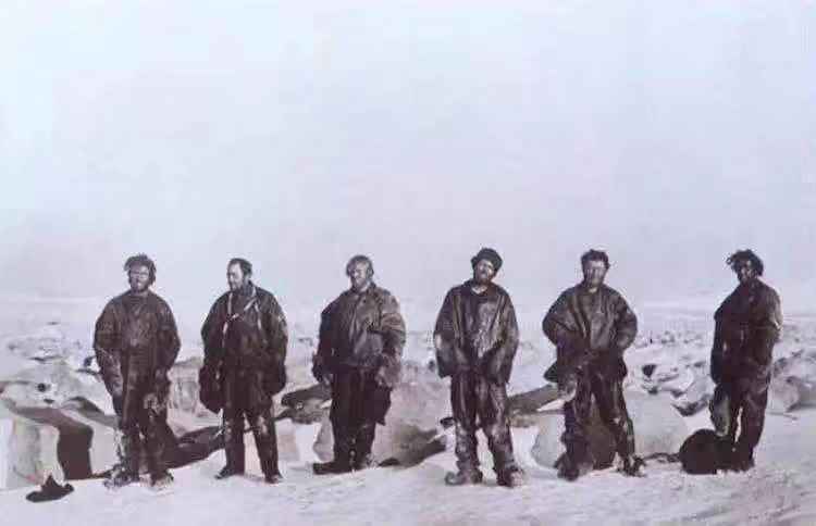 ▲1912. 9 难言岛(恩克斯堡岛) “特拉诺瓦”号斯科特探险队幸存的6名队员,包括皇家海军指挥官维克托·坎贝尔、医生默里·利维克、地质学家雷蒙德·普利斯特里