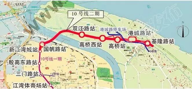 10号线二期:线路全长10.08公里,共设6座车站,分别为国帆路、双江路、高桥西、高桥、港城路(可换乘6号线)、基隆路站,其中地下车站1座,高架车站5座;设港城路停车场,主变电所设在停车场内,控制中心接入一期工程控制中心。车辆采用A型车,初期新增配车12列/72辆 。