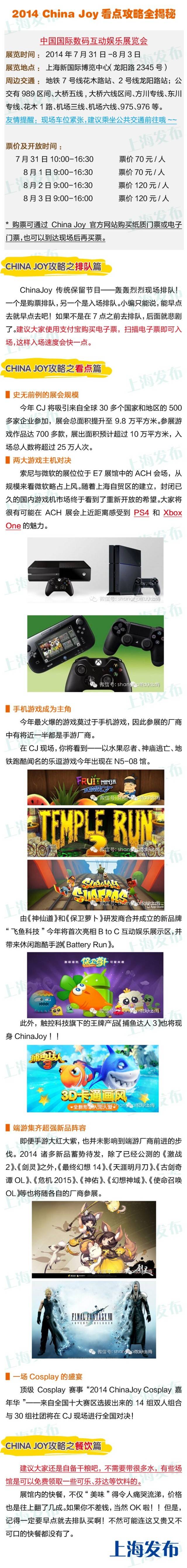 一年一度的电子饕餮盛宴ChinaJoy明起4天登陆上海,你准备好了吗?市旅游局说,500家游戏硬件展商、700款顶尖游戏、1200台体验机,到底哪些最值得一看?怎么玩最过瘾呢?游玩攻略新鲜出炉,排队攻略、精彩看点、餐饮提示一网打尽。