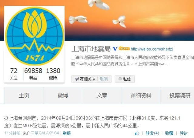 上海地震局最新消息,据上海台网测定:2014年09月24日09时03分在上海市青浦区(北纬31.0度、东经121.1度)发生0.6级地震,震源深度5公里,震中距人民广场约44公里。