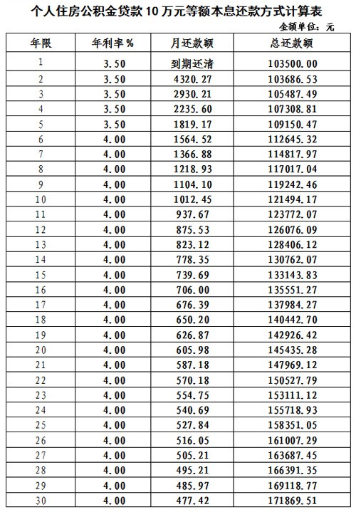 个人住房公积金贷款10万元等额本息还款方式计算表
