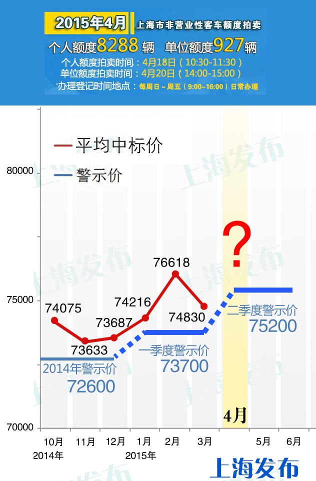 国拍公司今天公告:4月份车牌拍卖将于4月18日举行,个人额度8288辆,比3月份7406辆多882辆。今年2季度的警示价为75200元。
