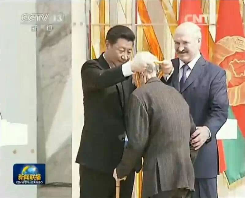 颁奖结束后,习近平发表讲话,代表中国政府和人民向老战士们致以崇高敬意和诚挚问候。习近平指出,第二次世界大战期间,白俄罗斯人民打响了卫国战争的第一枪,表现出百折不挠的英雄主义精神,赢得了世界各国人民的广泛赞誉和尊重。今年也是中国人民抗日战争胜利70周年。中国人民抗日战争开始时间最早,持续时间最长,付出的牺牲也最大,为世界反法西斯战争胜利作出了不可磨灭的重要贡献。当年在共同抗击法西斯主义和军国主义侵略的战争中,白俄罗斯人民同中国人民并肩作战,用鲜血结下了牢固友谊。我们深切怀念那些为夺取抗战最终胜利、保卫世界和平而献身的两国英烈,中白两国人民将永远铭记他们的丰功伟绩。卢卡申科总统在卫国战争历史博物馆新馆开馆时曾说过,对篡改第二次世界大战历史、美化侵略的企图,白俄罗斯人民绝不会答应。我对此深表赞同。我们愿同包括白俄罗斯人民在内的世界人民一道,共同维护第二次世界大战胜利成果和国际公平正义。