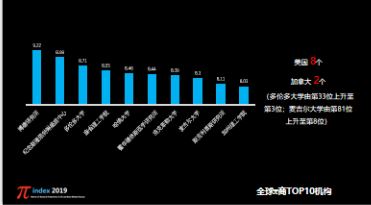 全球π因子TOP500中,哈佛大学以π因子266.36(2017为276.42)遥遥领先于全球其他机构;中国科学院以π因子80.07(2017为74.17)仍居全球第八;中国有44个机构进入全球π因子TOP500,比2017年新增6个机构,分别是西安交通大学、南方医科大学、南开大学、香港科技大学、北京师范大学和暨南大学。