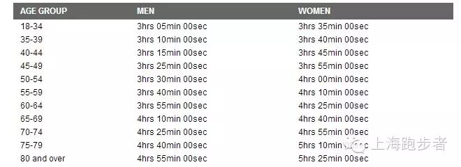 各种年龄组的最低成绩门槛(Boston Qualify,简称BQ) 如下图 ,第一栏为年龄,第二栏对应男子选手的达标成绩,第三栏对应女子选手的达标成绩。