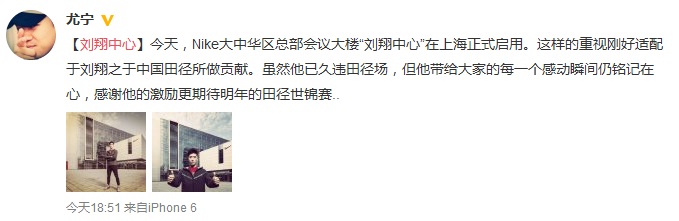 2014年“光棍节”(11月11日),早已正式脱单的“飞人”刘翔却迎来了人生中的另一个重要时刻——在位于杨浦区的耐克集团大中华区总部内,一座以其姓名命名的会议大楼“刘翔中心”正式启用,与不久前启用的办公楼“李娜楼”一同占据了办公区主体区域。