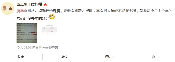 据不少微博网友反映,报名过程中厦马官网曾多次出现服务器奔溃、网页无法刷新或者无法支付的现象。开放报名首日,线上名额即告爆满!