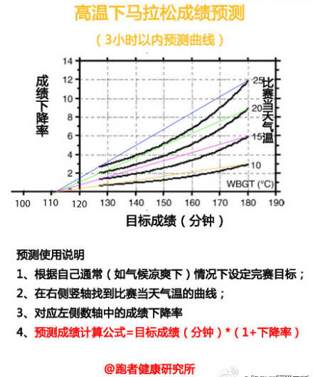 关于高温对于跑步成绩的影响,微博上一位名为 @跑者健康研究所 的网友曾综合大量数据,制作出如下一张表格: