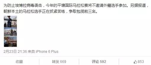 “为防止埃博拉病毒袭击,今年的平壤国际马拉松赛将不邀请外籍选手参加。另据报道,朝鲜本土的马拉松选手正在抓紧苦练,争取包揽前三名。”
