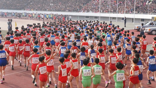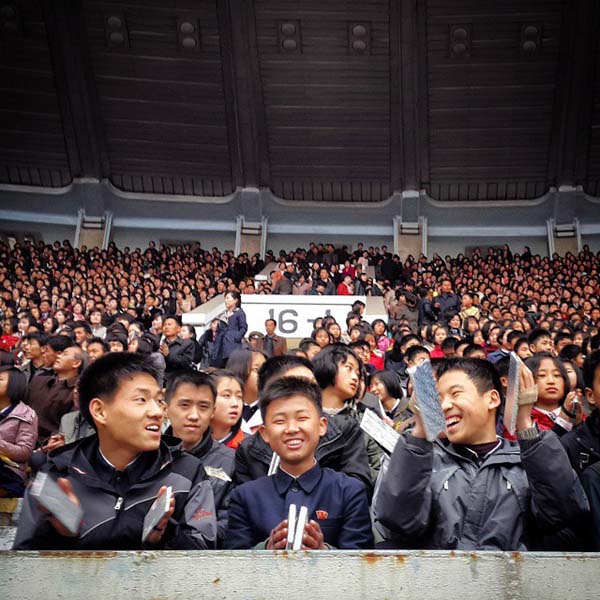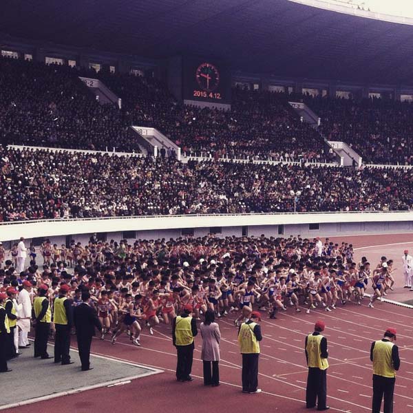 “比赛的起点和终点都被设置在可以容纳7万人的金日成体育场内。当天,体育场的看台上聚集了近5万名平壤市民。人群中,有人穿着破旧的老式西服,有人则穿着色泽鲜艳的新衣,一眼就能分辨出哪些是穷人,哪些是富人。