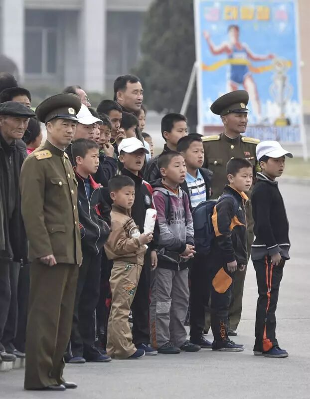不少围观小朋友都穿着“D.P.R.K”(朝鲜民主主义人民共和国)的外套。