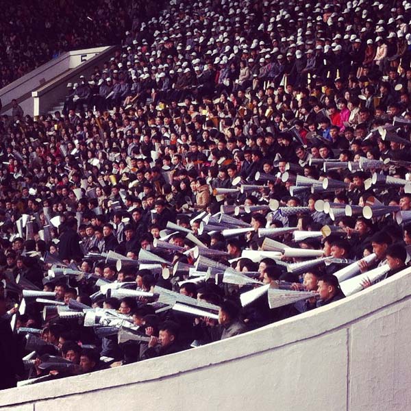 比赛当天,金日成体育场的看台几乎座无虚席,平壤市民们则用拍手板或独特乐器,为运动员们壮大声势。