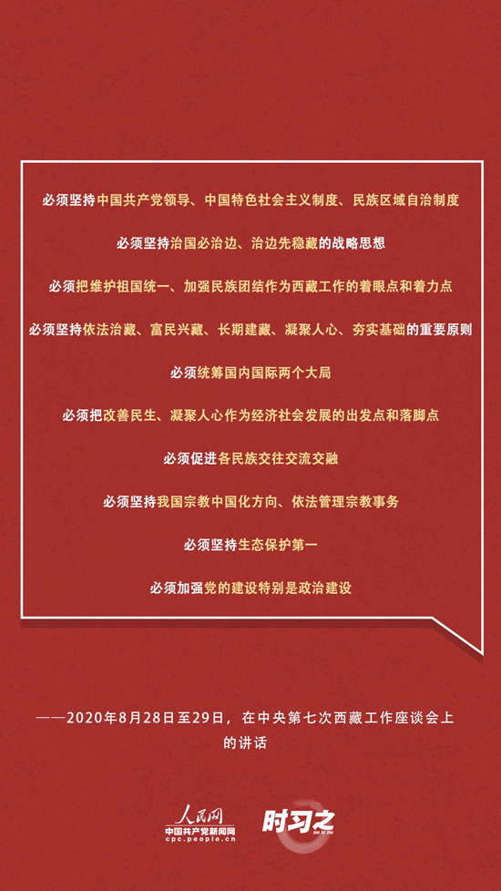 面对西藏工作面临的形势和任务的深刻变化,习近平在中央第七次座谈会上强调:“新时代党的治藏方略是做好西藏工作的根本遵循,必须长期坚持、全面落实。”对此,习近平提出了10个“必须”——