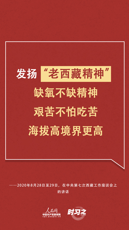 “缺氧不缺精神、艰苦不怕吃苦、海拔高境界更高,在工作中不断增强责任感、使命感,增强能力、锤炼作风。”习近平在座谈会上再次为发扬“老西藏精神”作出注解。同时,习近平也提出要关心爱护西藏干部职工,完善好、落实好工资收入、住房、就医、子女入学、退休安置等各方面支持政策,重视健康保障工作。