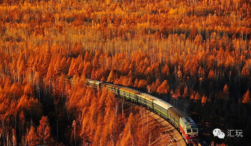 铁路线如长龙般蜿蜒于林区间,将这如画的美景串联起来,坐着火车感受东北独有的"铁道秋色",别有趣味。