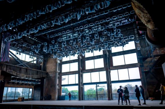 作为“船厂1862”中唯一的表演展示空间,隈研吾在1862时尚艺术中心的设计中巧妙地保留了建筑本身的历史感和工业感。在这里,观众和游客能够清晰地感受到历史的痕迹,得到一种“博物馆式”的体验。生锈的铁管、风化的混凝土柱子,甚至油漆涂就、隐约可见的生产标语,在设计师的图纸上,变成了1862时尚艺术中心独特的建筑风格。