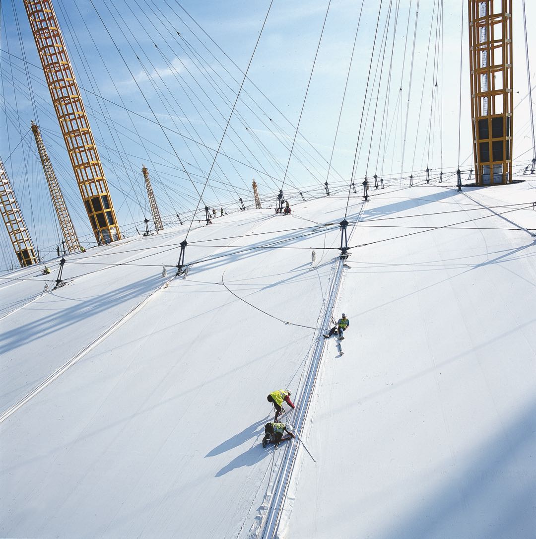 ▲伦敦格林尼治千年穹顶的聚四氟乙烯膜,我们在一年多的时间内就完成了整个建筑,据说这座建筑的重量比它所含的空气都要轻
