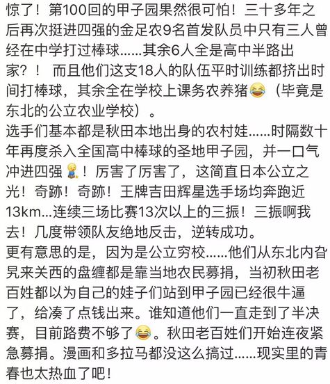 金足农全体队员来自日本东北部秋田县乡下,没有一个外援,真可谓是杂草球队了。三年级主力9人中6个都是半路出家,从高中才开始系统棒球训练。二年级的替补球员基本是来加油助威的,所以比赛至今一直都是这9名三年级球员首发。