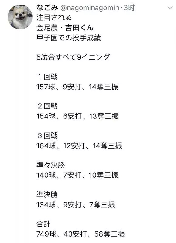 接下来我们再看看“漫画的男主角”:金足农的王牌投手吉田辉星。
