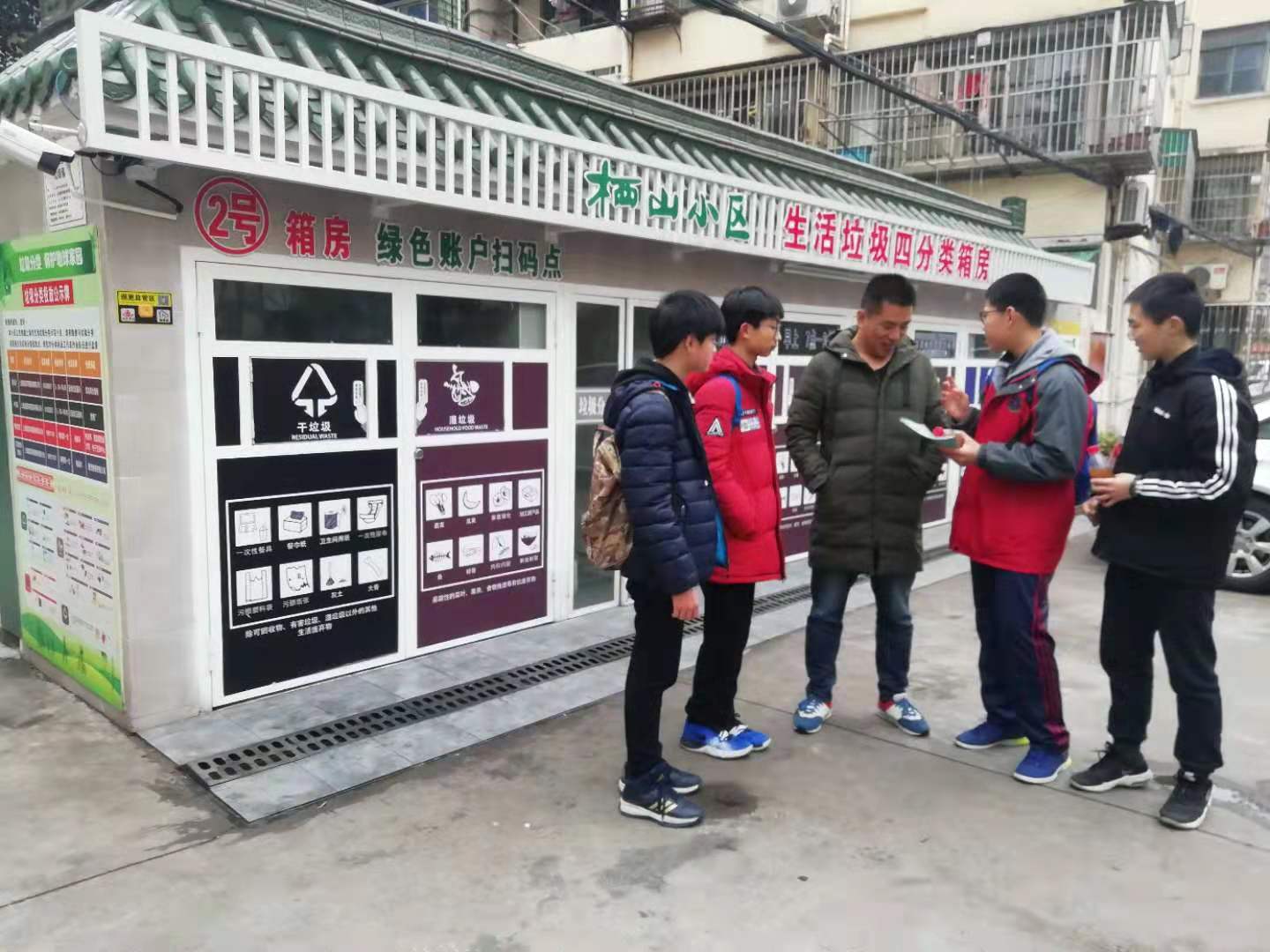 寒假里,上海市金杨中学初二学生李佳煜一直在为宣传垃圾分类奔走着,他和3名同学来到栖山小区。在“生活垃圾四分类箱房”旁,他们向过往的居民宣传垃圾分类知识。“您好,请问您知道怎么将生活垃圾进行正确分类吗?”迎面走来一位男士,李佳煜上前一步询问。“我还真的不是很清楚。”“如果您现在有空,我们来和您聊聊吧。”