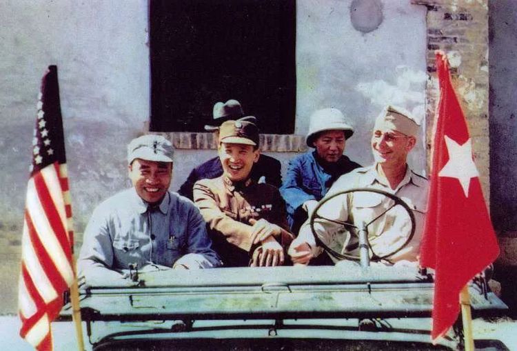 ▲1945年毛泽东迎接赫尔利、张治中到延安吉普车上