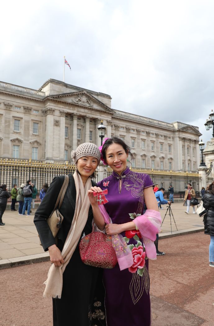 ▲授勋结束后,朱小久和友人在白金汉宫门口合影