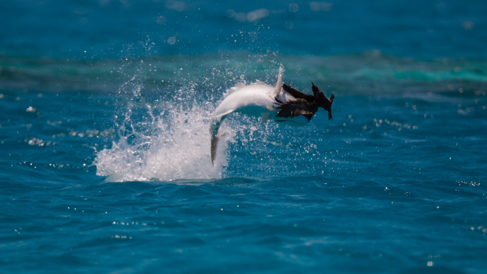 在南非的大海上,一群海豚破浪而出,它们优美的身体曲线在碧海蓝天间时隐时现,画出一个个发光的圆弧。这是纪录片中让观众记忆深刻的一幕,而这场视觉盛宴背后却蕴含着巨大的拍摄风险——这片海域是冲浪海豚的栖息地,却也因为风浪极大而得名“狂野海岸”。为了在高达六米的巨浪中灵活穿梭,追踪海豚的冲浪活动,摄制组特地请来了当地的专业冲浪手当向导,扛着高速摄像机在海浪中一边冲浪一边搜寻。