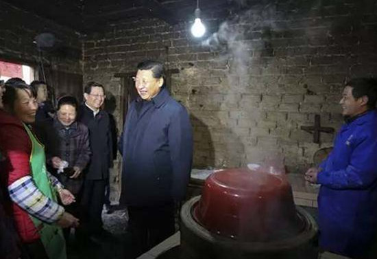 2016年2月,习近平在江西调研考察。在贫困户张成德家中,习近平一间一间屋子察看,看吃得怎么样,住得是否温暖,电视能看多少个台。(图片来源:新华社)